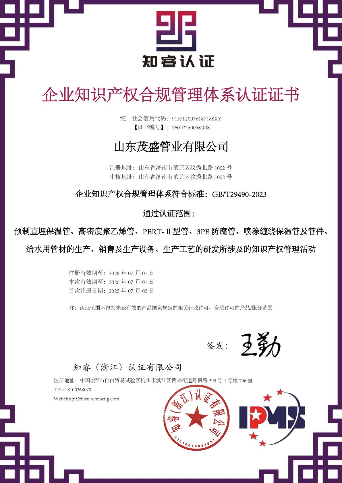 知识产权管理体系认证证书